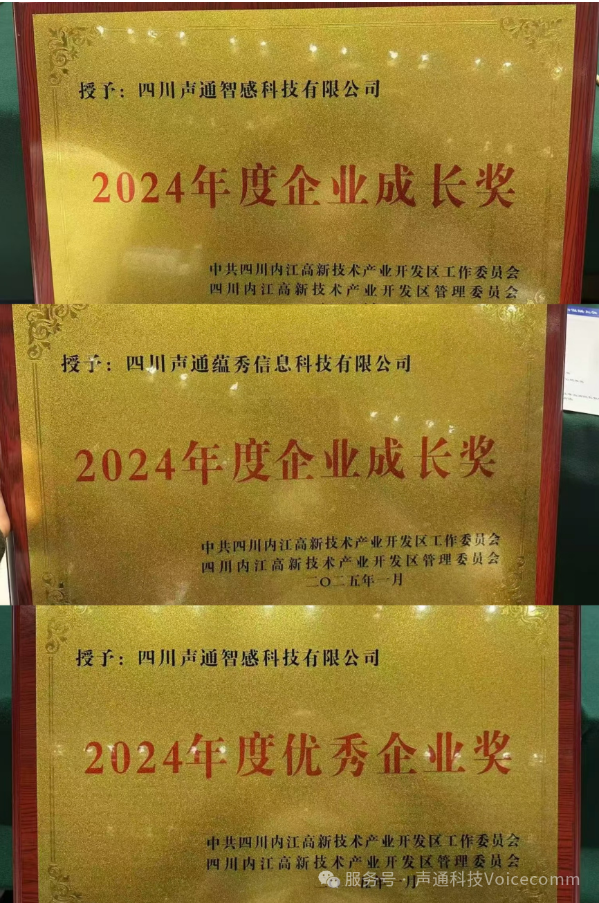 声通科技旗下两家子公司在会上收获多项殊荣。其中,四川声通智感科技有限公司荣膺2024年度“企业成长奖”和“优秀企业奖”,四川声通蕴秀信息科技有限公司荣获2024年度“企业成长奖”。这些奖项不仅是对声通科技在技术创新与产业赋能中的突出贡献的高度肯定,也彰显了企业扎根内江、助力区域高质量发展的深远价值。