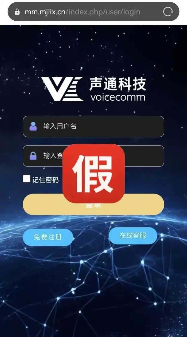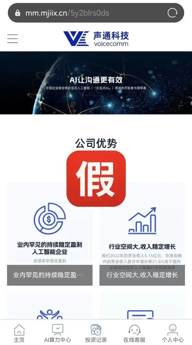 近日,我司(「声通科技股份有限公司」,以下简称“我司”)发现有不法分子恶意冒用我司注册商标、企业标识,并制作了高度仿真的虚假网站(「mm.mjiix.cn」),通过线上渠道进行宣传,以“投资”名义诱导公众,涉嫌从事诈骗等违法犯罪活动。